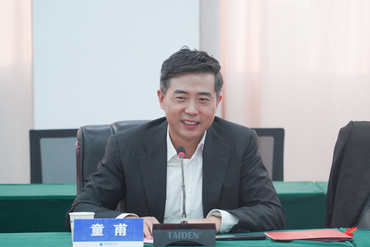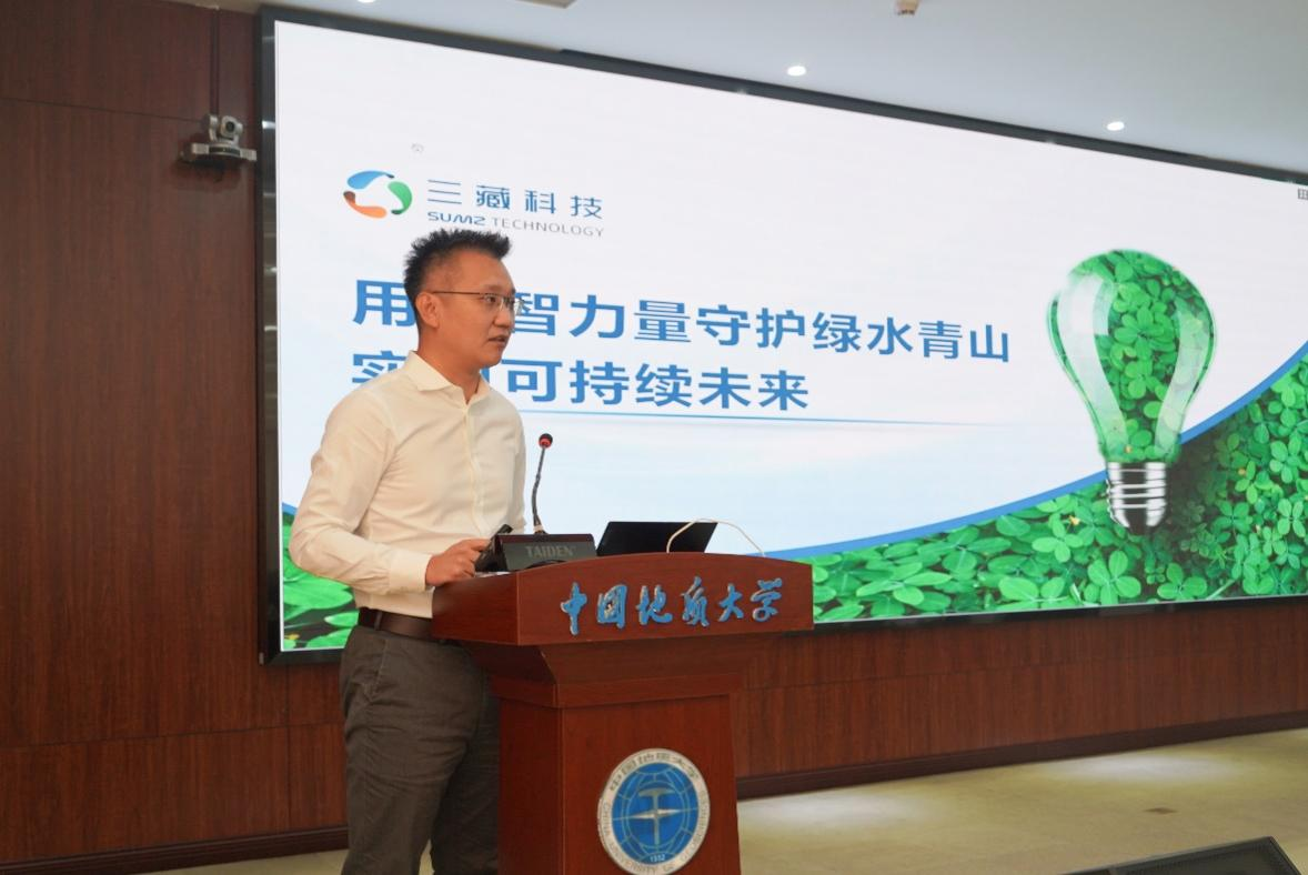 童甫讲话。他指出,地大大气学科是华中地区最早的大气科学专业,近些年来取得了突出的成绩。作为北大大气科学专业科班出身的学长,始终关心和关注着地大大气学科的发展,此次能为大气学科本科生人才培养提供助力,深感荣幸,对大气学子的人生发展提出了殷切希望。他表示,作为在家乡创业的公司,希望能跟地大拓宽合作范围,在项目申报、学生实习实训、人才培养、成果转化等多方面提升合作成效,为区域环境、气象、双碳等领域事业发展贡献更多力量。