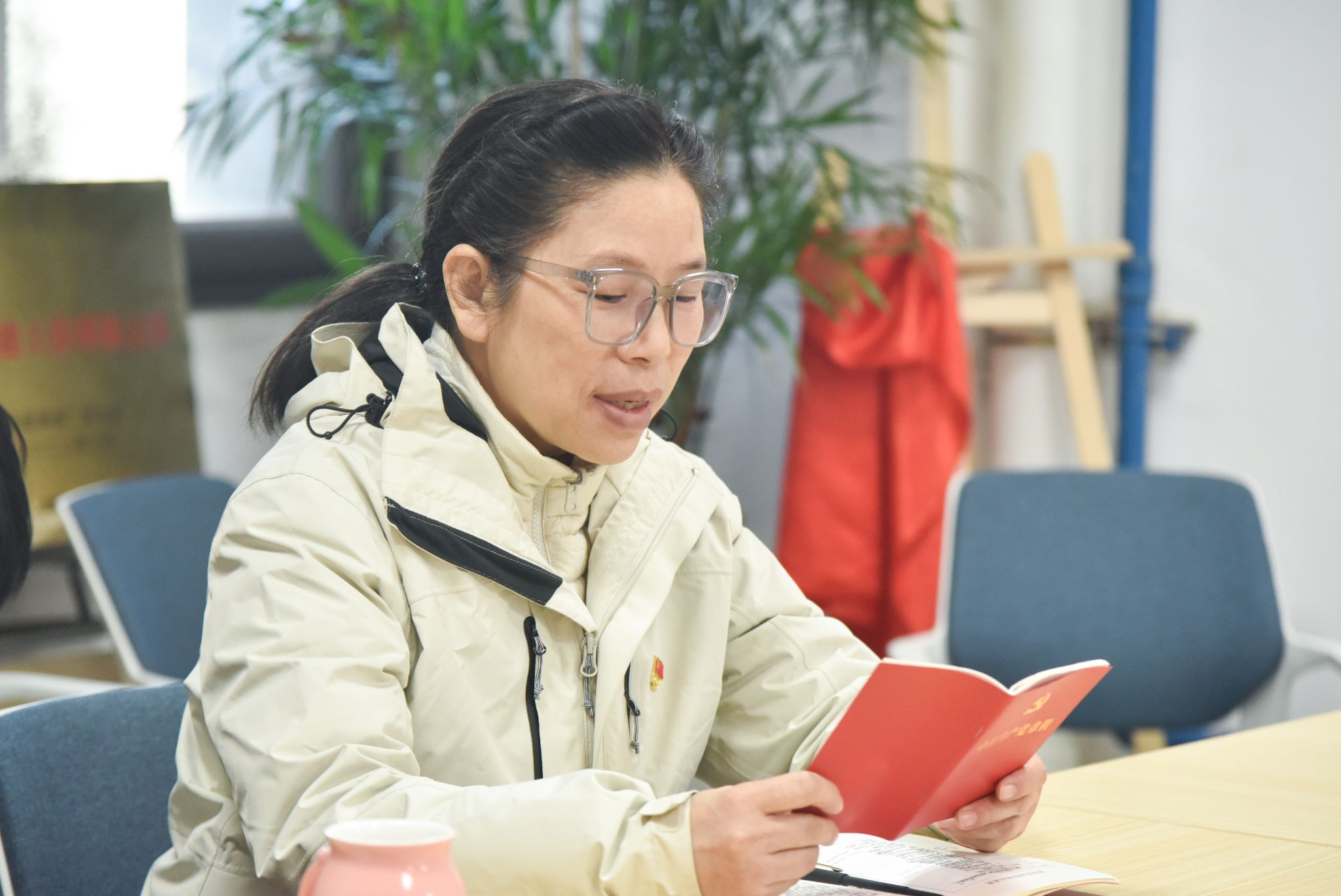 院直党支部有计划地组织诵读党章。左麦枝同志诵读党章的第六章——党的干部。