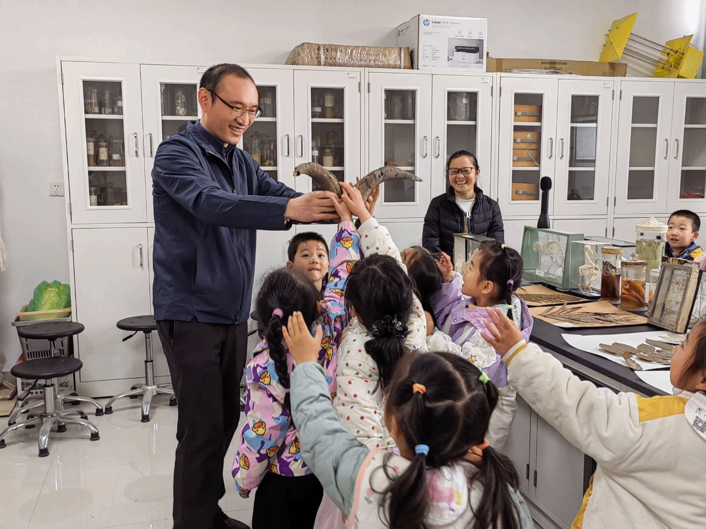 (通讯员蒋永光、胡译丹 摄影 蒋永光、刘源 编辑王孟雪)3月19日与3月26日上午,中国地质大学未来城附属幼儿园的小朋友们在老师的带领下,兴致勃勃地参观了beat365中文官方网站生物科普标本室,开启了一场奇妙的生物探秘之旅。标本室老师、研究生和绿色协会的同学带小朋友们浏览了形态各异的昆虫标本、栩栩如生的动物标本以及色彩斑斓的植物标本,用生动形象的语言,为他们讲解了各种生物的形态特征、生活习性以及在地球环境中的作用。小客人们听得津津有味,并提出各种有趣的问题。此次科普活动不仅丰富了小朋友们的课外知识,激发了他们对自然科学的兴趣,也让他们感受到了生物多样性的魅力,增强了保护生态环境的意识。相信这次奇妙的生物探秘之旅,将在小朋友们的心中播下热爱自然、探索科学的种子。