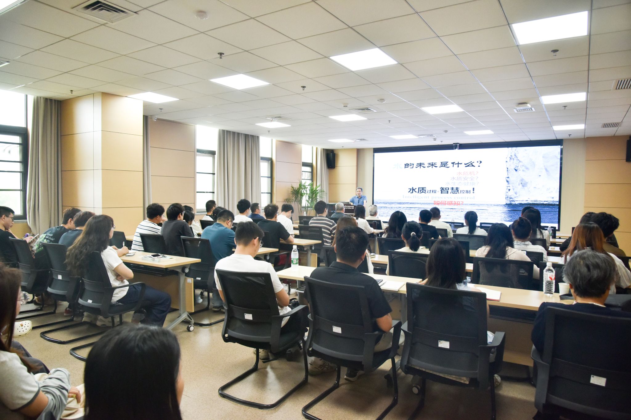 报告围绕“水的世界、水质过程、智慧感知与未来水世界”四个主题展开。王东升教授指出,水质与水量之间的矛盾是21世纪人类社会面临的重大挑战之一,呼吁当代每一位中国人都应树立水资源忧患意识。他重点阐述了污水处理新范式的核心理念,强调水质处理与中水回用在未来城市可持续发展中的重要意义。