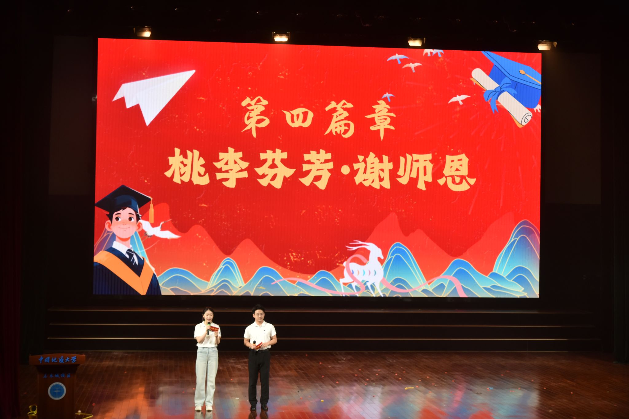 第四篇章“桃李芬芳·谢师恩”。活动现场播放了由毕业生精心制作的感言视频,同学们以真挚的语言回顾求学时光,向母校和师长表达深切感恩之情。随后,举行毕业纪念品互赠环节,教师代表向毕业生赠送学院文创纪念品,学生代表向教师代表献上感恩之花。