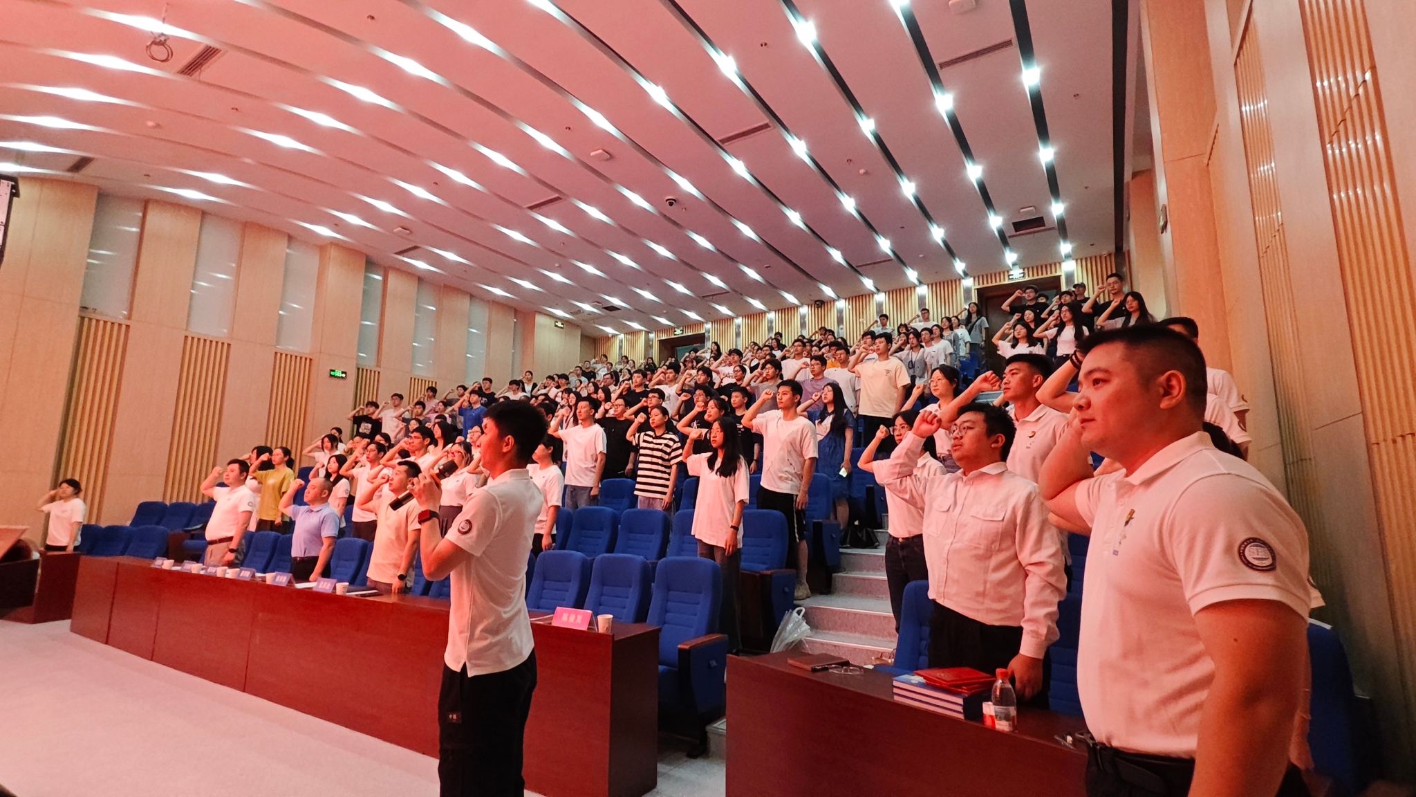 全体毕业生党员齐唱国歌,重温入党誓词。“张国旗班”党支部黄聪明领誓。