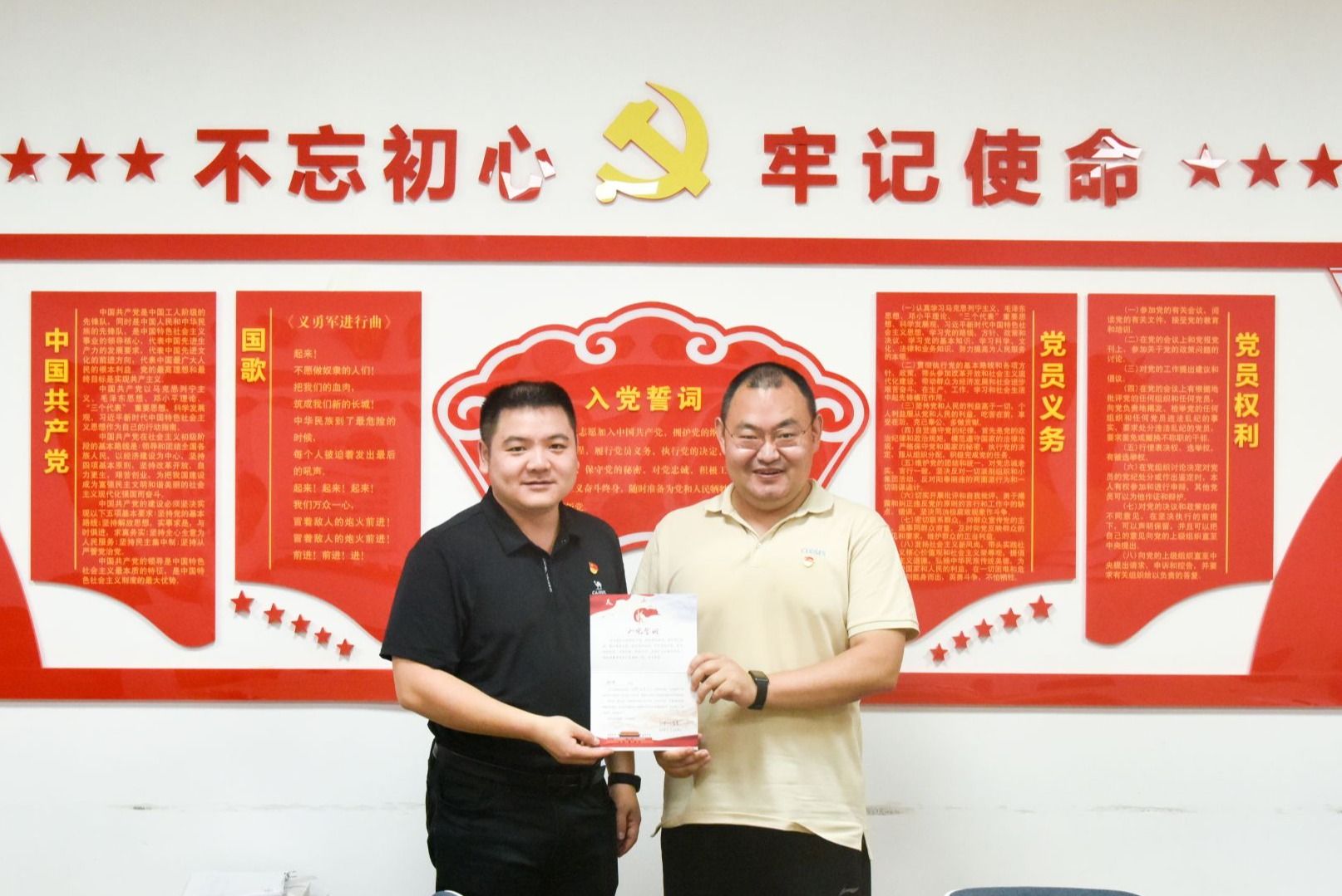 陈俊男为杨涛同志颁发政治生日纪念卡。