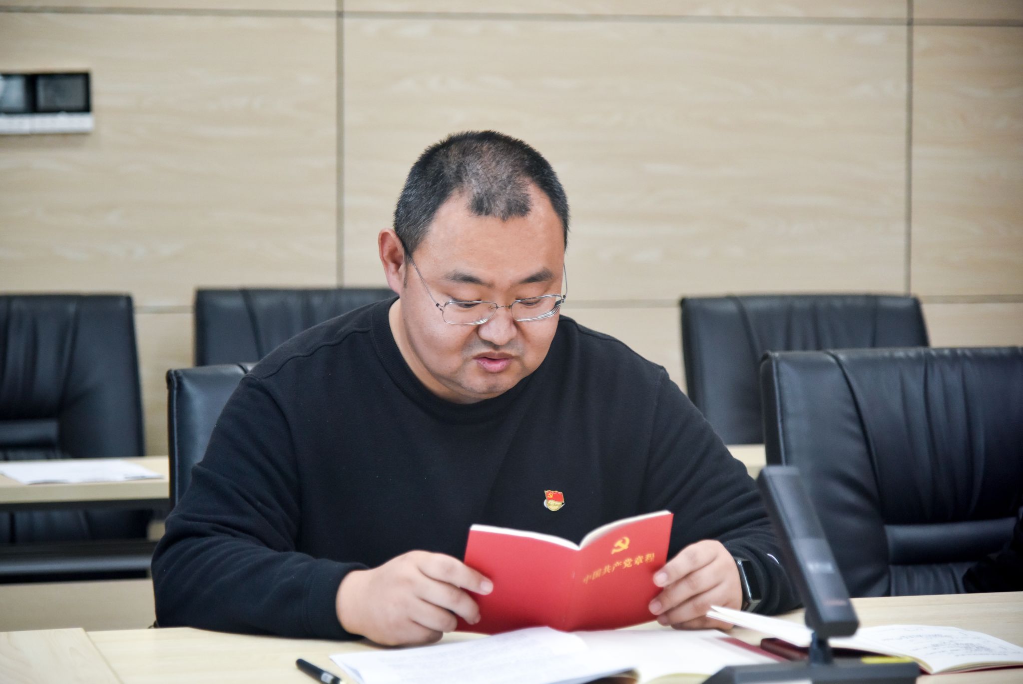 院直党支部有计划地组织诵读党章。杨涛同志诵读党章总纲的部分内容。