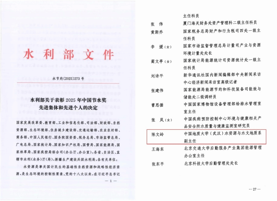 (通讯员刘凤莲 编辑申墁烨)12月26日,首届中国节水奖颁奖大会在北京隆重召开,相关盛况获《新闻联播》报道。会议对2025年度中国节水奖先进集体与先进个人进行表彰,经中国地质大学(武汉)后勤保障部与beat365中文官方网站联合推荐,教育部审核推荐上报,beat365官网水资源与水文地质系副主任陈文岭同志荣获“中国节水奖先进个人”称号,系湖北省高校唯一获此殊荣者。该荣誉的取得,既是对陈文岭同志个人及所在团队科研工作的高度认可,也是beat365中文官方网站长期深耕水资源领域科研创新、培育优秀科研人才的成果彰显,更是学校整体节水工作成效与科研创新的集中体现,为学校及湖北省高校赢得了荣誉。