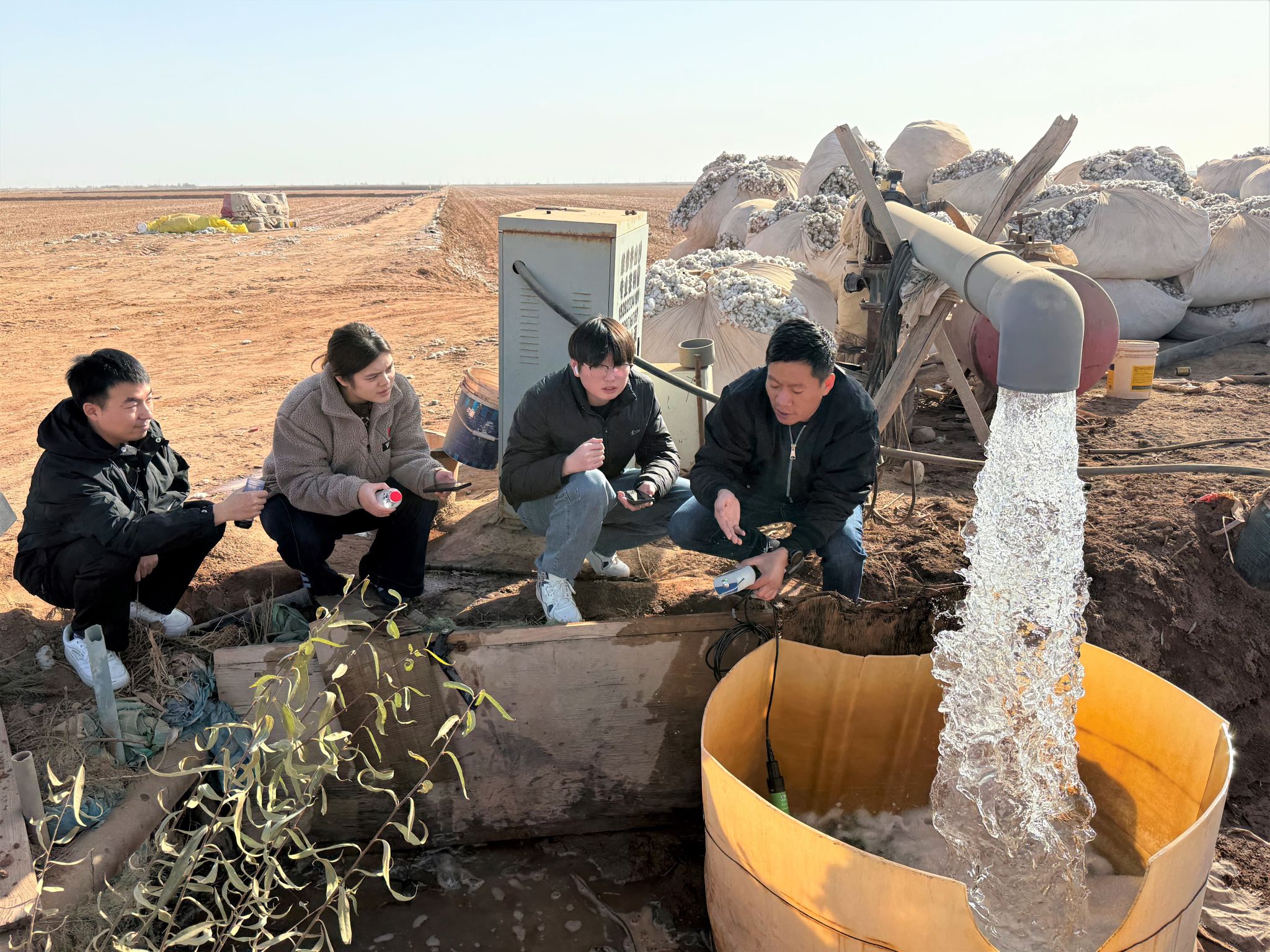 补建伟带领塔里木大学本科生在棉田里开展地下水监测工作