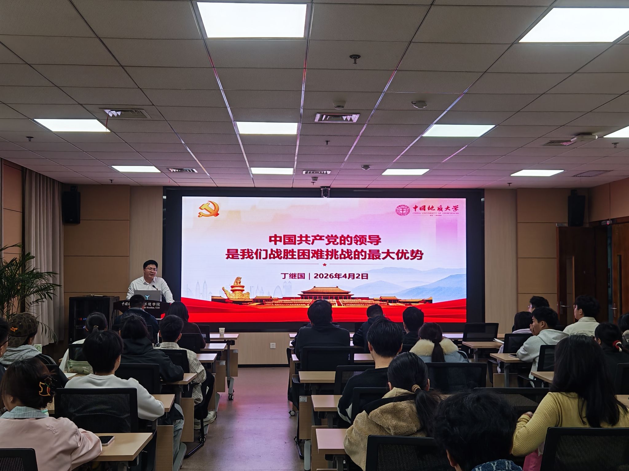4月2日中午,学院党委副书记、纪委书记丁继国以“中国共产党的领导是我们战胜困难挑战的最大优势”为题,在环境楼322报告厅为培训班成员讲授专题党课。他围绕党的百余年辉煌历史、党在战胜困难挑战中不断前进的历程、党总能化危为机的原因以及新时代青年的担当作为四个方面展开讲解。结合党的一大与红船精神、八七会议、遵义会议、皖南事变、转战陕北、十一届三中全会及抗击新冠肺炎疫情等重大历史节点,他深入阐释了党依靠坚定信仰、科学理论、群众路线、铁的纪律、自我革命精神和斗争智慧,一次次化危为机、转危为安。他指出,党的领导是战胜一切困难和风险的最大底气,勉励全体学员深刻领悟“两个确立”的决定性意义,增强“四个意识”、坚定“四个自信”、做到“两个维护”,坚定信念跟党走,勇做奋进者、开拓者、奉献者,努力成长为红专能优的生态环保铁军,用青春的智慧和汗水为美丽中国宜居地球建设贡献自己的力量。