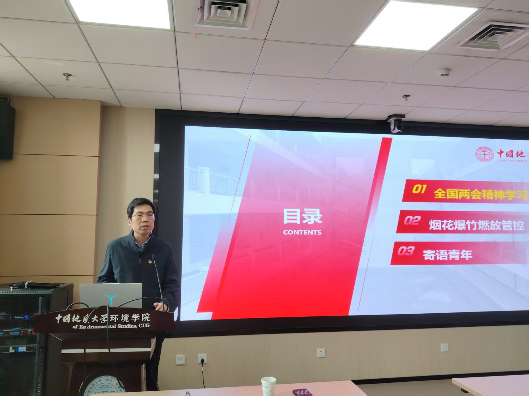 3月27日中午,学院党委委员、副院长、大气科学系教授孔少飞以“深入学习贯彻全国两会精神 投身美丽中国建设主战场”为题,在环境楼322报告厅为培训班学员讲授专题党课。孔少飞系统领学全国两会精神,重点解读“十五五”时期绿色低碳发展目标,特别是单位国内生产总值二氧化碳排放累计降低17%等关键指标。结合学院学科特色,他从大气环境视角深入阐释《生态环境法典》中烟花爆竹管控条款,通过多年研究数据,生动展示了燃放烟花爆竹对PM2.5浓度的显著影响,充分证明禁限政策对改善空气质量的积极作用。他指出,党的领导在生态文明建设中具有战略引领作用。他勉励学员秉持“认真、求实、守正、奉献”的品格,争做有理想、敢担当、能吃苦、肯奋斗的新时代好青年,努力成长为红专能优的生态环保铁军,用青春的智慧和汗水为美丽中国宜居地球建设贡献自己的力量。