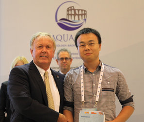 beat365官网博士研究生王家乐同学在第42届国际水文地质学家大会上发表的关于区域地下水流系统的研究成果喜获最佳论文奖。 (张学海编辑) 国际水文地质学家协会主席Ken Howard教授为王家乐颁奖