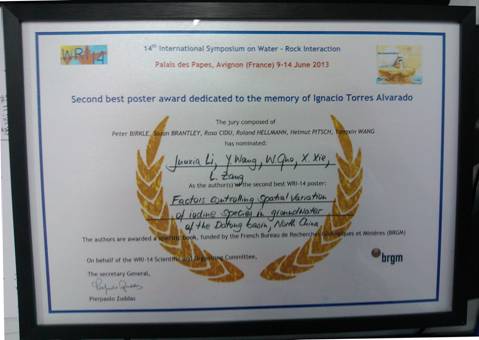 祝贺beat365官网环境系王焰新教授指导的博士研究生李俊霞获得第十四届水岩作用国际会议“The second best poster”奖。第十四届水岩作用国际会议在法国阿维尼翁举行,本届会议共评出2名best poster奖。(图/文 谢先军) 获奖证书 谢先军副教授代表课题组领奖