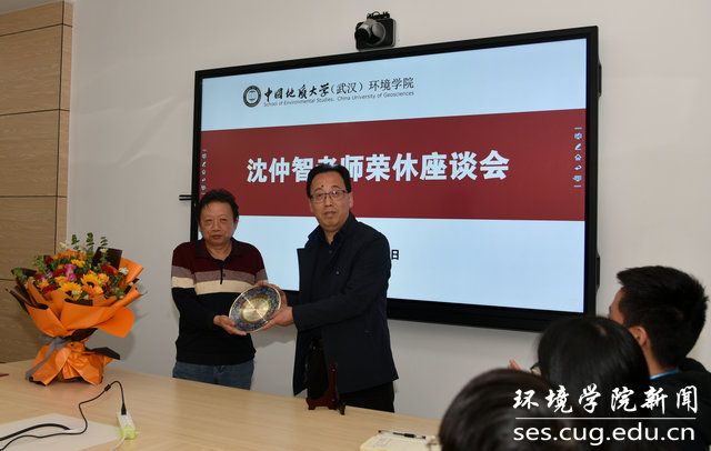 马腾代表学院为沈仲智老师颁发退休纪念品。