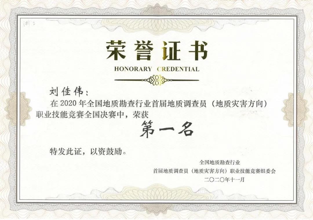 2020年11月13日,全国地质勘查行业首届地质调查员(地质灾害方向)职业技能竞赛在广西柳州落下帷幕。经过激烈角逐,刘佳伟以理论考试第一、野外实操考核第一的优异成绩斩获个人第一名,被授予“全国地质勘查行业优秀地质调查员(地质灾害方向)”的荣誉称号,同时也为浙江队获得团体第二名立下汗马功劳。