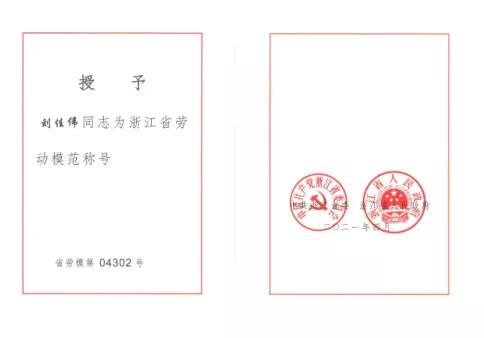 刘佳伟获2021年“浙江省劳动模范”