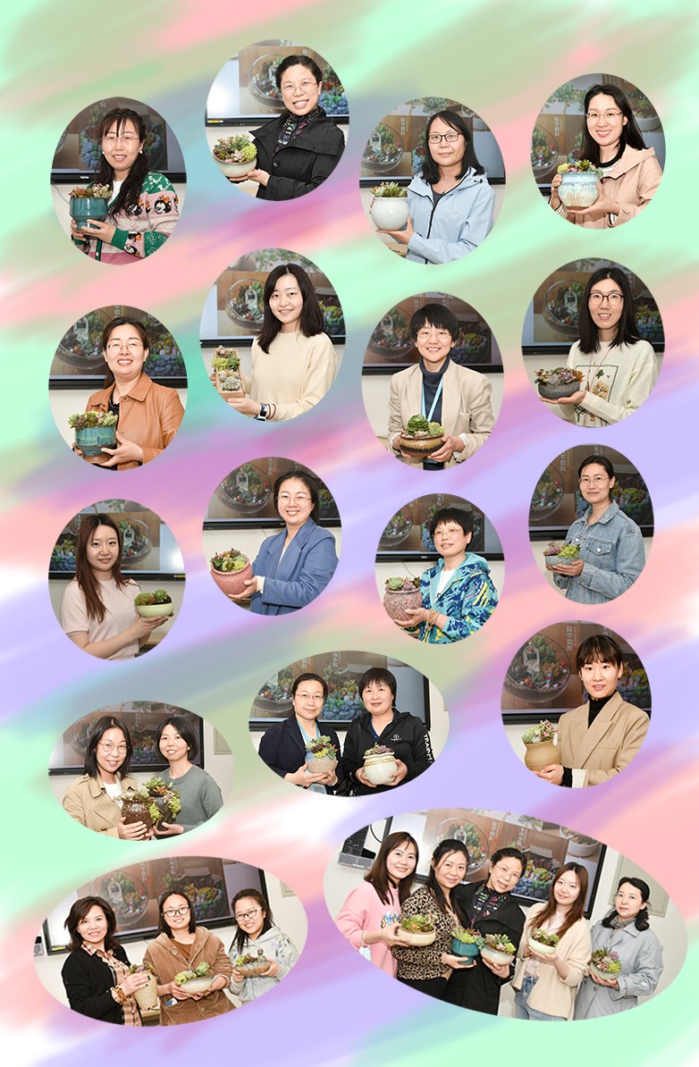 同日,学院工会邀请专业花艺师,现场讲授多肉养护、扦插、搭配知识,指导大家进行多肉种植。活动现场欢声笑语,老师们享受生活,享受创作乐趣。历经一个小时的创作,每位老师都完成了一件属于自己的多肉作品。这些或置于办公桌或放于窗台的多肉盆栽作品,默默关注着beat365官网女教工的辛勤工作,代表着工会的陪伴与祝福。