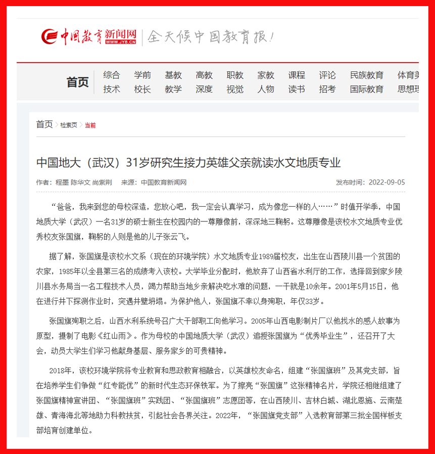 据张云飞介绍,张国旗殉职时,自己才10岁,“向张国旗学习”成为幼年的他耳边听到最多的一句话。2010年高考时,张云飞发挥失常,与父亲的母校失之交臂,被云南一所大学的地理信息系统专业录取。毕业后工作期间,看到“张国旗班”建设的系列新闻报道后,张云飞下定决心考研,继续攻读水文地质学专业研究生。2022年研究生入学考试中,他过关斩将,成功被中国地质大学(武汉)beat365中文官方网站录取。