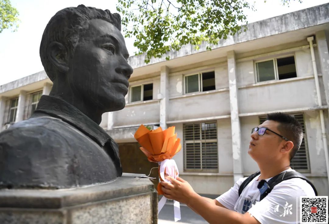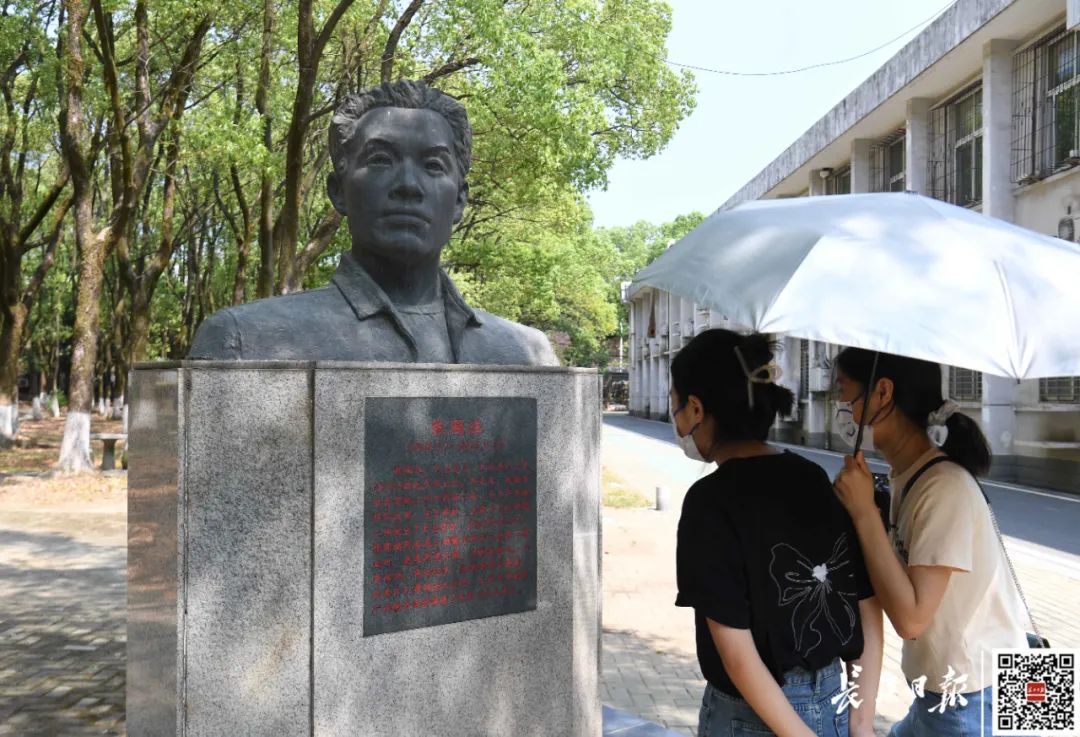 地大学生在张国旗雕像前看英雄事迹介绍。