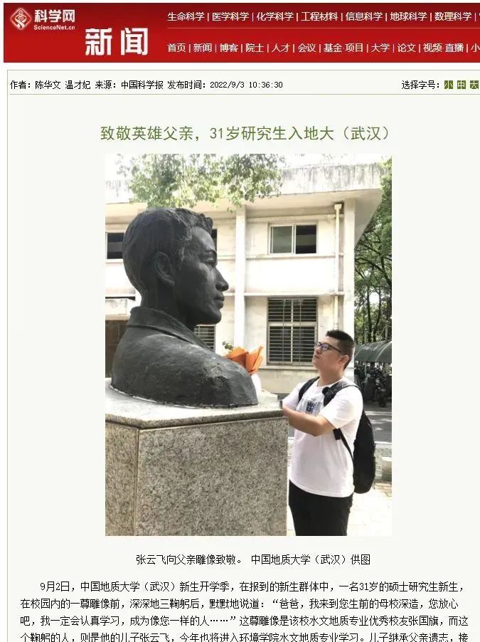 (转自中国科技报 作者陈华文 温才妃)9月2日,中国地质大学(武汉)新生开学季,在报到的新生群体中,一名31岁的硕士研究生新生,在校园内的一尊雕像前,深深地三鞠躬后,默默地说道:“爸爸,我来到您生前的母校深造,您放心吧,我一定会认真学习,成为像您一样的人……”这尊雕像是该校水文地质专业优秀校友张国旗,而这个鞠躬的人,则是他的儿子张云飞,今年也将进入beat365中文官方网站水文地质专业学习。儿子继承父亲遗志,接续学习水文地质学,感动了师生们。