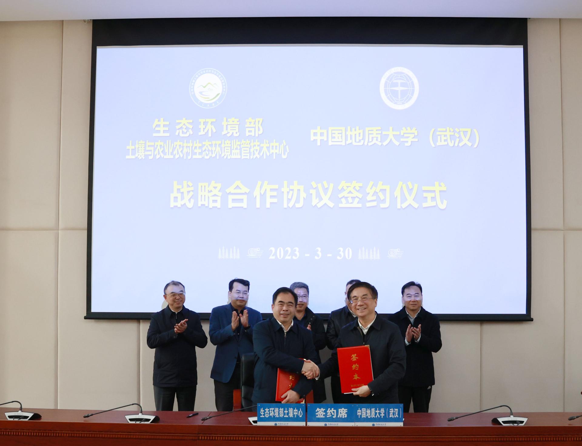 地大新闻网讯(通讯员 袁潇 摄影 赵婧萱)3月30日,生态环境部土壤与农业农村生态环境监管技术中心与我校在未来城校区签署战略合作协议。生态环境部土壤中心党委书记、主任洪亚雄,湖北省生态环境科学研究院党委书记、院长蔡俊雄,副院长向罗京,我校校领导王焰新、王华、唐忠阳参加签约仪式和座谈会。