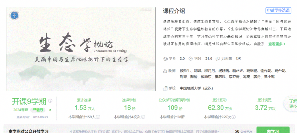 为了服务我校“美丽中国、宜居地球”战略规划与人才培养目标,自2019年秋季开始,教学团队(16人)率先给全校本科生开设《生态学概论》线上线下通识必修课。目前选课人数超22000人(含校外2500多人),累计选课学校16所。团队注重教学改革与创新,强化过程考核、增加生态价值等培养,促进学生全面发展;侧重课程内容的重构,体现生态与地学、环境科学的交叉;将思政元素有机融合于课程教学,讲好中国故事,弘扬人文与科学精神;丰富的课外实践活动不仅增强了大学生生态热情,而且促进了生态素养的形成。