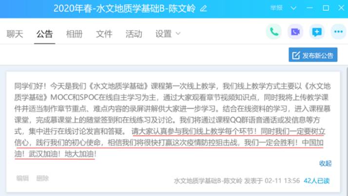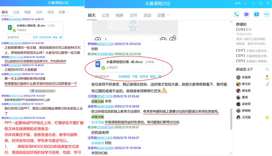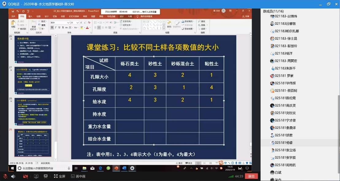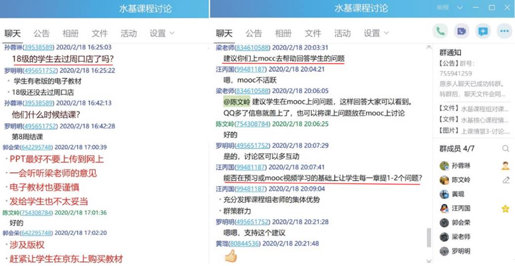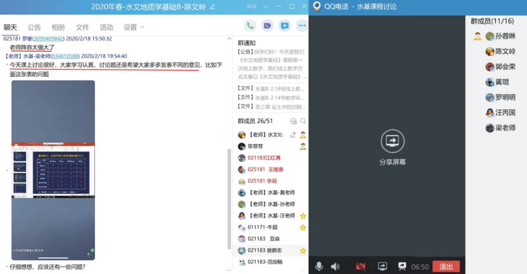 对课程组两位任课老师线上教学时遇到的具体问题,随时在课程组群里进行交流讨论。为了及时对线上教学过程中出现的问题进行总结,优化混合教学模式,切实提高教学效果,课程组团队全体成员于2月18日聆听陈文岭老师为资源学院和地学院讲授《水文地质学基础B》线上课程。课后,课程组通过QQ群语音通话方式进行了集体研讨(约90分钟),对本次线上教学过程中取得的效果、出现的问题进行了系统的总结,集体备课、集中讨论对优化混合教学模式和线上课程的高效开展大有裨益!