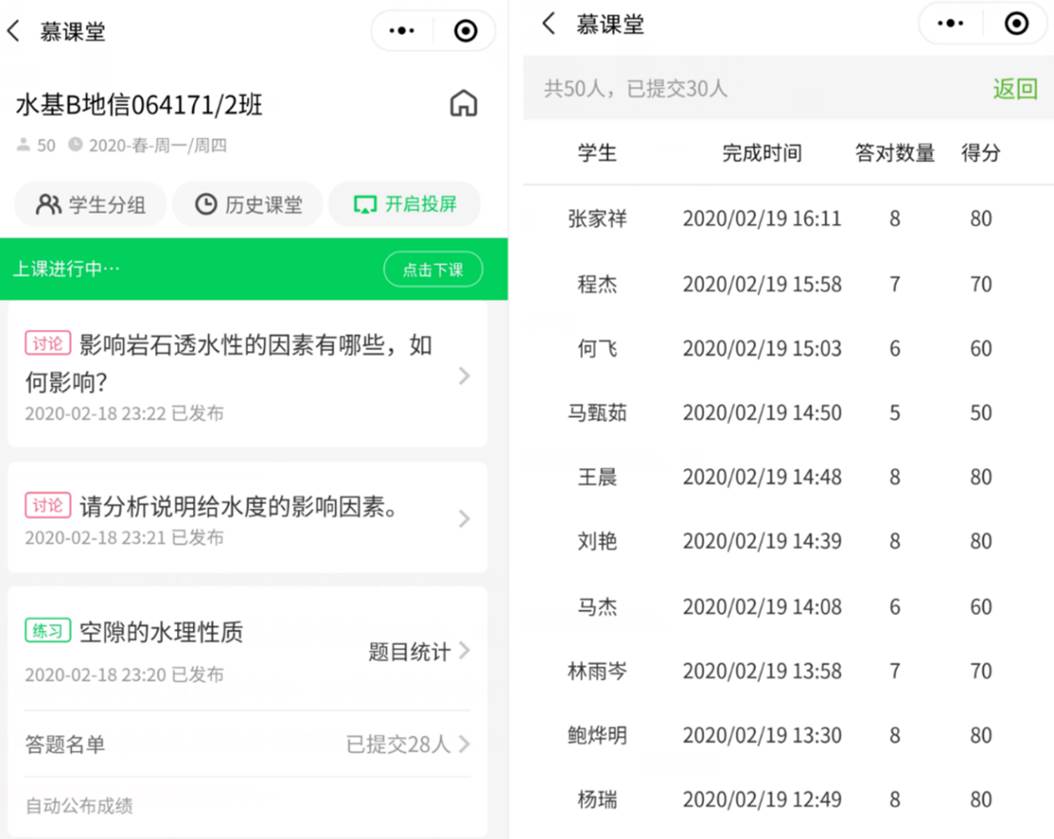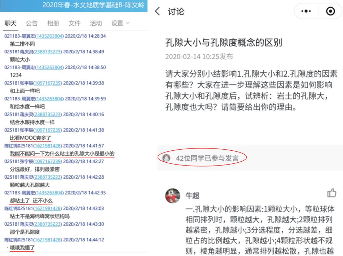 水文地质学基础课程组承担了2020年春地空学院、资源学院和地学院三个学院的授课任务,授课团队前期有《水文地质学基础》MOOC建设良好基础。面对疫情,课程组黄琨和陈文岭老师成为MOOC-直播混合教学模式的吃蟹人。经过前期精心准备,两个教学班(4个行政班)均已顺利开展了3次混合式教学。