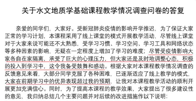 通过在线课程教学情况问卷调查,收集学生线上学习反馈并回复,及时调整线上教学方式,使学生尽快适应线上学习。例如:通过调查,学生反映慕课堂中的讨论只能在手机端操作,打字不方便并且影响大家听课,针对该问题今后的讨论环节将不需以文字的形式在慕课堂平台中回复,改为以点名+语音交流讨论的形式进行。另外,学生建议增加白板替代传统的板书,这个建议很好,将在后续教学过程利用白板功能软件辅助教学。