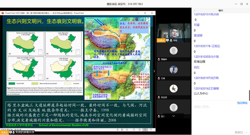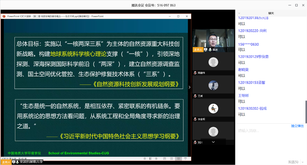2月17日下午14:00,准时开课,在线听课学生约170人。柴波老师主讲《环境地质学的基本概念与生态文明》,结合习近平总书记的生态文明建设相关讲话和“绿水青山就是金山银山”的理论,对相关概念进行拓展融合,以提高学生的生态保护意识和人文思想。中间依托慕课堂做辅助,提出问题让学生回答,统计结果。两个学生通过PPT分享自己MOOC学习的理解。