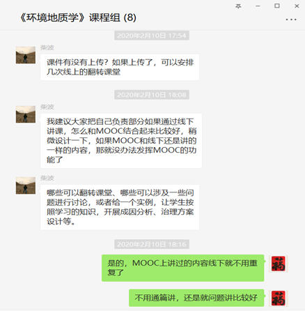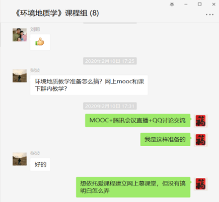 鉴于《环境地质学》之前在爱课程网站建有MOOC课程,因此经大家讨论决定采用的在线远程教学模式是:MOOC+腾讯会议直播+QQ交流(或慕课堂配合提问)。