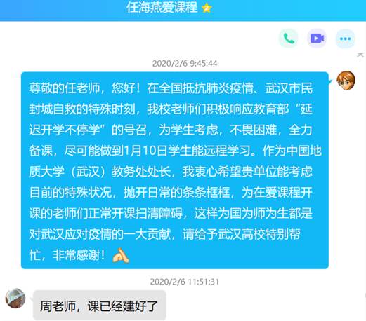 与爱课程网联系后,因上期课程还没有完全结课,所以导致MOOC第二次开课受到影响。考虑到校内其他课程组可能存在同样问题,以教务处处长名义出面联系爱课程网的课程开课负责人,希望能考虑到武汉的特殊疫情形势,为我校老师提前开课。