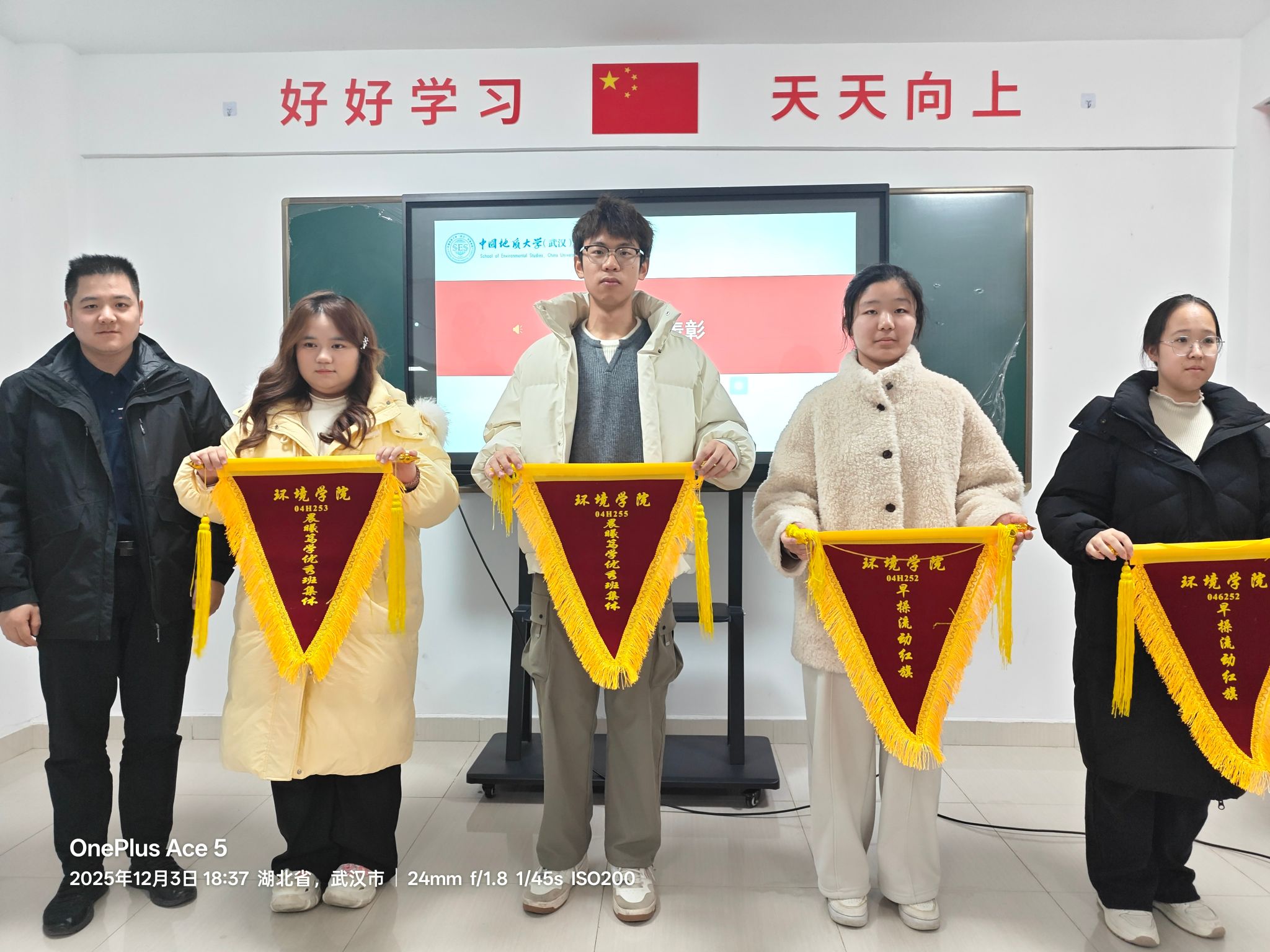 会议对获得“早操流动红旗”的4个班级进行表彰。陈俊男为046252班、04H252班、04H253班和04H255班等4个班级进行颁奖。