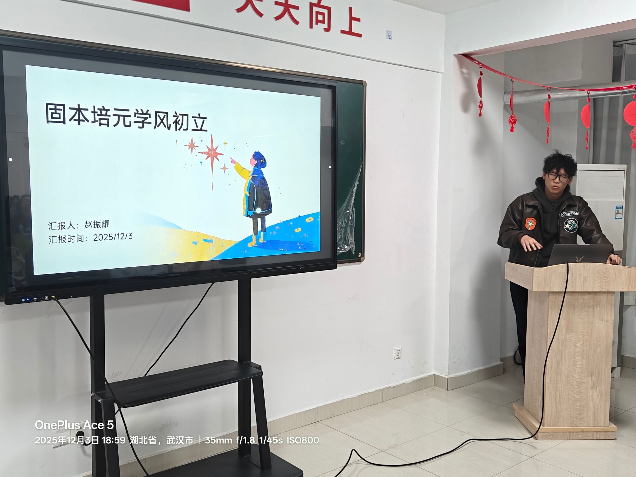 (通讯员董玉 摄影2025级年级工作组 编辑申墁烨)为深入推进2025级本科班级学风建设,凝聚学风建设共识,2025级年级工作组于12月3日晚在南望山校区63栋103举行2025级本科学风示范班级创建答辩会暨学风建设推进会。2025级专兼职辅导员、年级工作组全体成员、各班学习委员、“最美示范笔记”和“最美笔记”获奖同学以及“早操流动红旗”班级代表共同参会。年级工作组副组长盖博元主持会议。