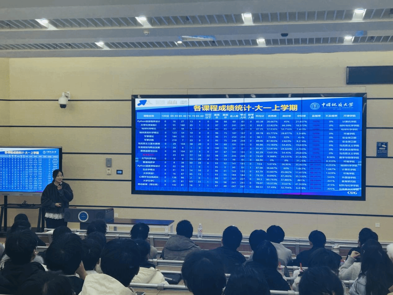 会议最后,辅导员宋霖老师基于详实的数据,对年级前三个学期的学业情况进行了深度剖析。通过对各班级、各专业课程成绩、不及格率、平均学分绩点排名的系统梳理,清晰勾勒出年级整体学业状况与各专业成绩画像。结合2022级毕业生的保研比例等数据,为同学们提供了直观的升学前景参考。此外,宋老师还就即将进行的大类分流安排、日常学习考勤规范等事宜进行了说明,帮助同学们精准定位自身学业水平,明确后续努力方向与阶段目标。