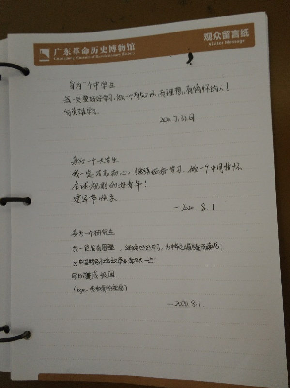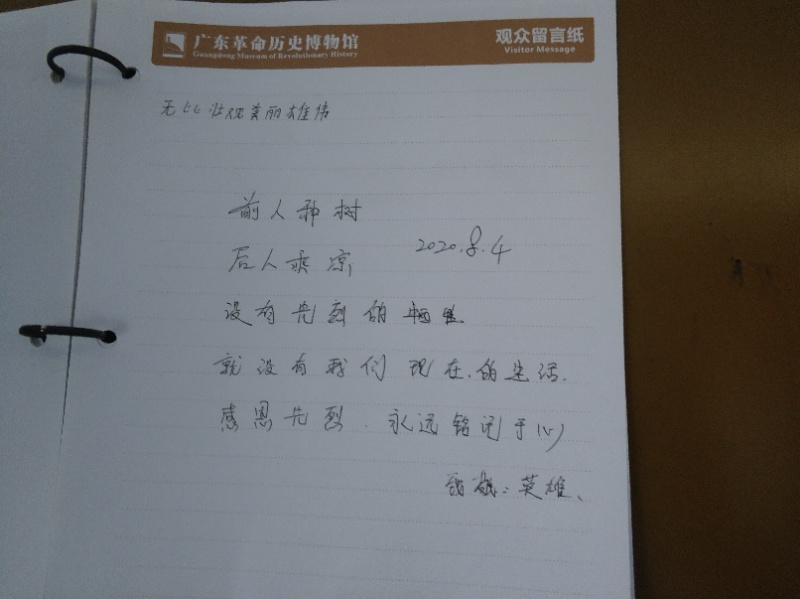我看到了广东人民在近百年中华民族奋斗历程所做出的卓越贡献,为民族发展所立下的决心,庄严肃静的烈士陵园,让我想起电影《八佰》中,谢晋元团长说:“国家兴亡,匹夫有责。我们是中国人,要有中国人的志气……只要我们还有一个人,就要同敌人拼到底。”近百年的兴衰荣辱,先烈们用平凡肉身之躯撑起了五星红旗。作为当代青年人,不应忘记历史,更要有担当精神。曾经,若国人皆如此,倭寇何敢?如今,若我辈皆如此,外敌何敢?