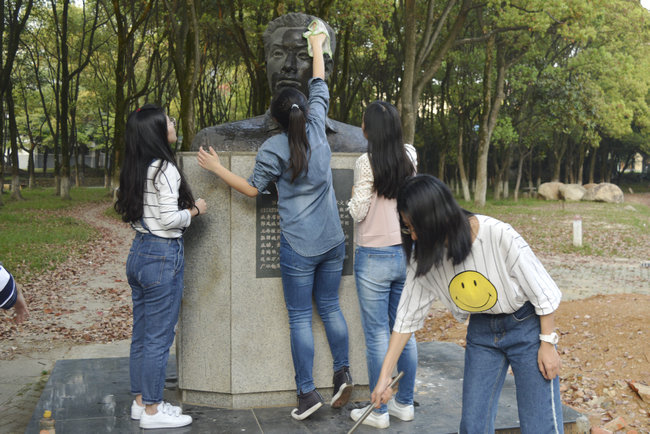 支部成员对张国旗雕像进行清洁打扫,使雕像焕然一新。