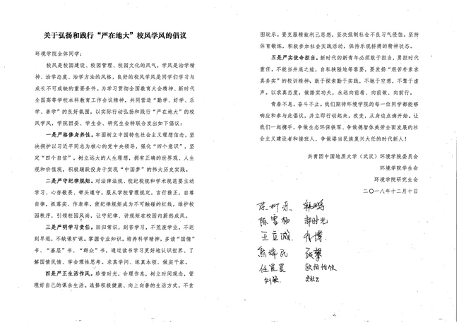 beat365中文官方网站学生会主席陈柳源宣读了由学院团委、学生会、研究生会联合发起的《关于弘扬和践行“严在地大”校风学风的倡议》,号召beat365中文官方网站全体同学严格修身养性、严守纪律规矩、严明学习责任、严正生活作风、严实使命担当,以实际行动争做生态环保铁军、争做德智体美劳全面发展的社会主义建设者和接班人、争做堪当民族复兴大任的时代新人。