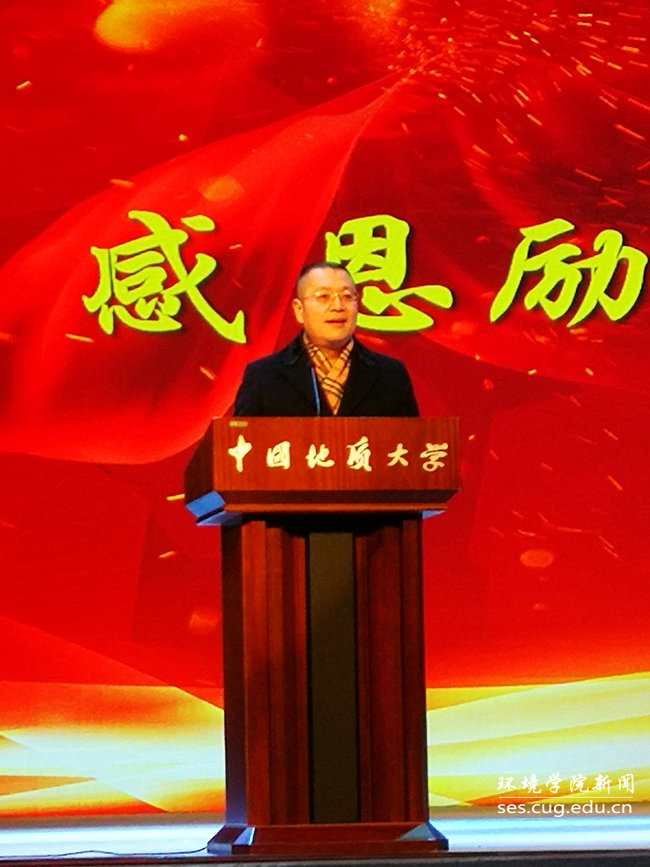 殷昌平校友代表王大纯基金所有捐赠人对获奖学生表示祝贺,并对辛勤付出的老师们表示衷心的感谢。他深情回忆自己的大学生活,与同学们分享自己在学生时期的付出、努力与收获,以及在创业过程中通过创新不断走向成功的经历。他说,王大纯励志奖学金设立的目的就是要告诉同学们立大志、创大业的道理;王大纯创新奖学金设立的目的就是要告诉同学们创新求变、适者生存的道理。他表示,命运不会辜负每一个认真而努力的人,希望同学们从现在开始,更加坚定、努力,勉励大家要立大志、刻苦勤奋、创新求变、勇攀高峰!