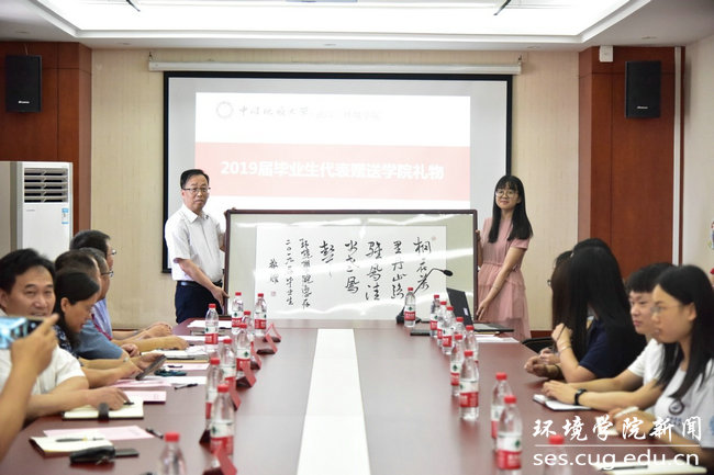本科毕业生郭文杰代表2019届全体毕业生向学院赠送礼物。马腾代表学院接收礼物。