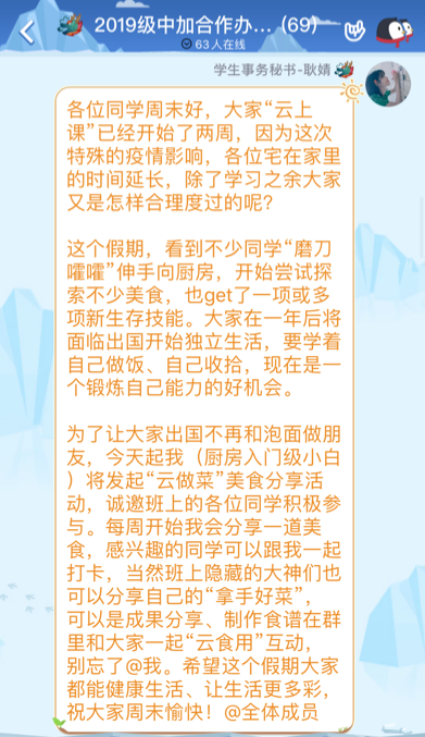 中加班试点实行“云做菜”美食分享活动