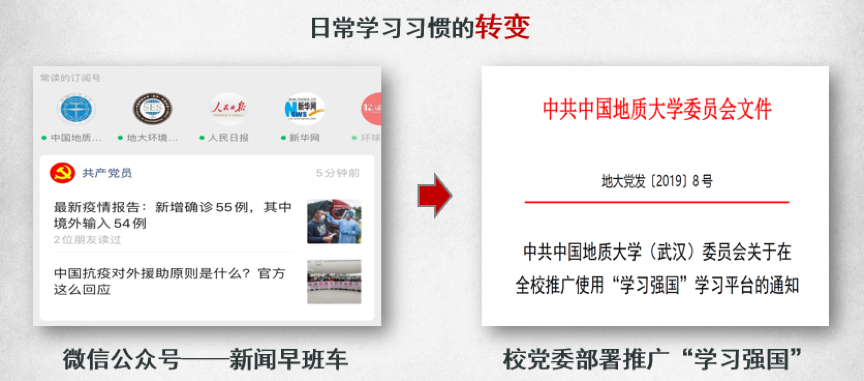 其实在学习强国上架之前,我也有每天阅读新闻的习惯,但是使用的是不同的软件平台,比如说早上洗漱的时候,我用微信公众号的推文来听新闻早班车。平时的零散时间,也会刷一刷央视新闻,其实并不是那么的方便。在2019年初的时候,学校党委下发了关于在全校推广使用“学习强国”学习平台的通知。我和大部分的党员同志一样,按照上级党委的统一部署,也就开始了我的学习强国之路。