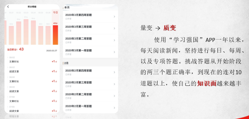 在我学习、使用平台这一年以来,我也感受到了些许的变化。最大的变化就是,我的知识面越来越丰富了,记得最开始的时候,挑战答题可能两三个题就做错了,现在基本可以保证连对10道题以上。我想这与我每天阅读新闻、坚持进行每日、每周、以及专项答题的积累有直接关系。