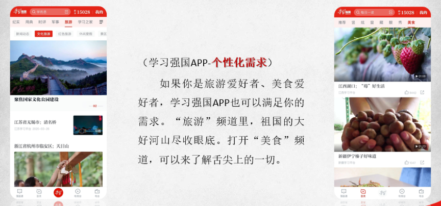 当然,如果你是旅游爱好者、美食爱好者,“学习强国”也可以满足你的需求。“旅游”频道里,祖国的大好河山尽收眼底。打开“美食”频道,可以来了解舌尖上的一切。