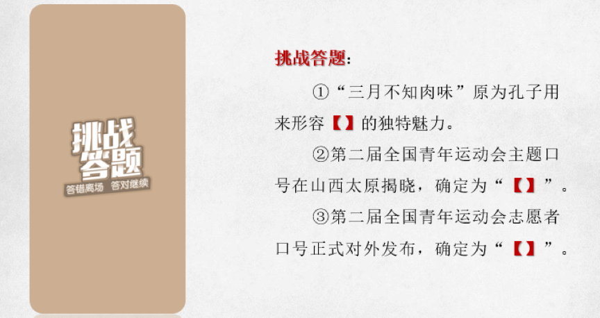 这里我列举了三道题,大家可以看一下。我和大家一样,因为坚持答题,我才知道了“三月不知肉味”是孔子用来形容音乐的独特魅力;第二届全国青年运动会主题口号是“青春的约会,拼搏的舞台”。而志愿者口号是“奉献二青,精彩三晋”。我猜经常答题的你们,是不是和我一样,经常把这两个口号搞混呢?