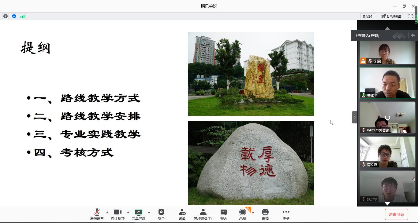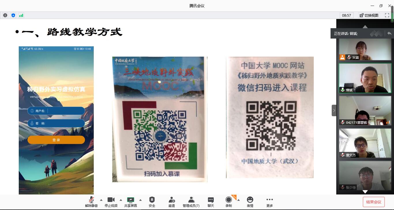 本次线上实习任务讲解分为路线教学实习、路线教学安排、专业实践教学、考核方式四部分,由实习队队长曾斌进行讲解。为保证本次线上教学质量,丰富学习内容,同学们分别要在MOOC三峡地质野外实践完成实习区区域地质认识、在MOOC秭归野外地质实践教学复习回顾野簿记录,地层剖面图绘制及地质填图等工作的方法、在beat365中文官方网站研发制作的秭归野外实习虚拟仿真软件完成教学路线的学习。同时,还要在MOOC完成环境地质调查思维与实战课程的学习。最后结合在秭归野外实习虚拟仿真软件的测评成绩与实习报告的得分给出最终实习成绩。最后,曾斌强调了野外实践学习的重要性,并鼓励大家只要认真学习,在线上学习也能收获满满!