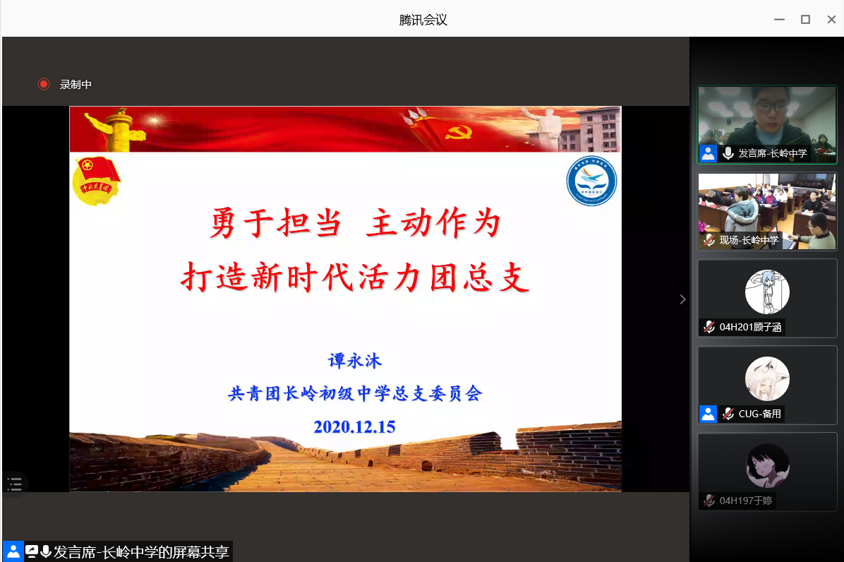 长岭初级中学团总支书记谭永沐介绍团总支发展情况。他说,在这一年里,团总支的工作得到了学校领导、各部门、各年段和各班主任的大力支持,特别要感谢中国地质大学(武汉)4位研究生支教教师对团总支的辛勤付出。在保证教学质量的前提下,教师克服教务工作繁多、学生克服课业任务繁重,长岭初级中学团总支牵头成立了学生会、广播站,创立了学校公众号,组织了书法比赛、演讲比赛、志愿活动、运动会、文艺晚会等活动,取得了一定成效,也得到了校内外各界人士的认可。