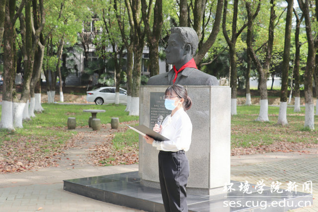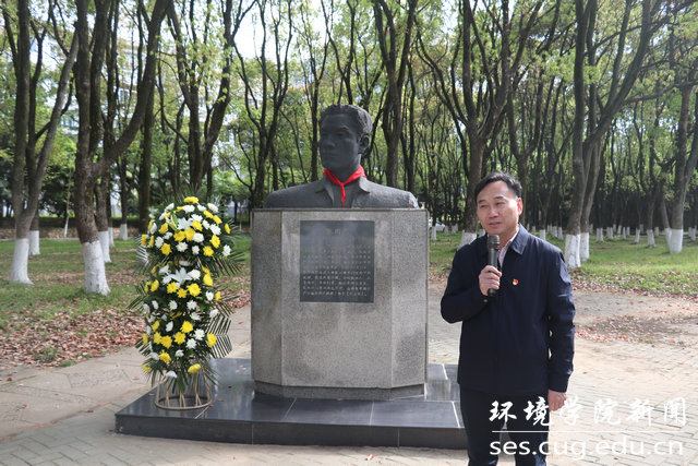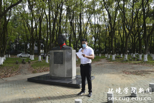 李素矿讲话。他指出,天地英雄气,千古尚凛然。张国旗塑像是校园里闪亮的地标。以英雄校友张国旗命名的党团支部和班团组织已经成为beat365中文官方网站乃至全校全国的精神品牌,是学院推进党建“双创”和“三全育人”工作的重要支撑。环境学子每年清明来此缅怀英雄校友,是同学们学习生活中的重要内容,也是向革命、建设、开放各个时期的英雄先烈致敬的重要方式。他强调,作为新时代青年学子,要通过缅怀英雄事迹和精神,学习英雄好榜样,强化不忘初心、牢记使命的意志,激励自己永葆赤子情怀、争优时代先锋。他要求,全院各党团组织、各班级、各位同学都要以传承红色基因、培育时代新人为己任,践行红专能优理念,创新开展党团活动,以德居之、以能居之,积极投身美丽中国建设,把论文写在祖国大地上,做政治强、本领高、作风硬、敢担当,特别能吃苦、特别能战斗、特别能奉献的新时代生态环保铁军。