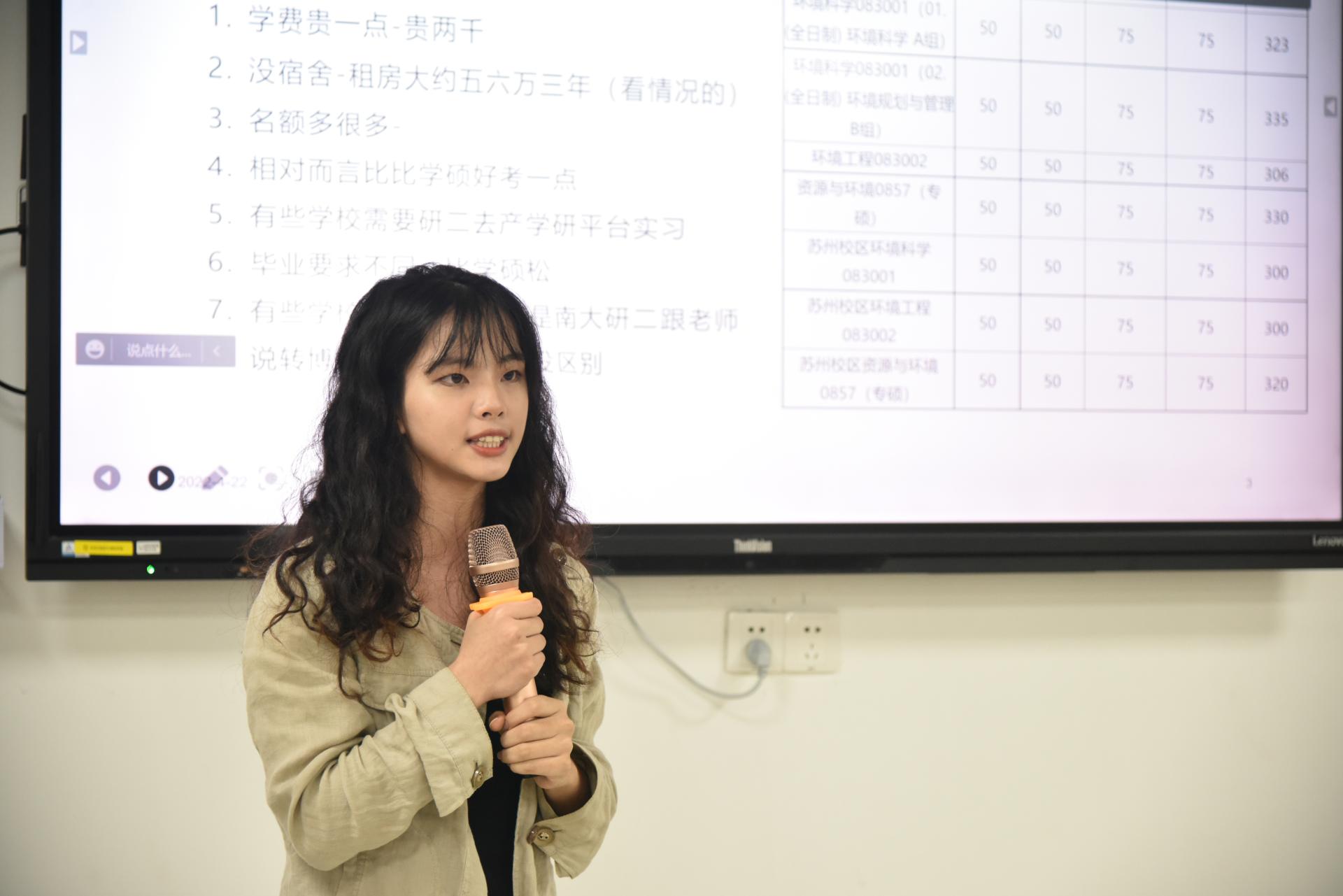 其次,2018级中加项目学生喻心玥、石陈微、刘玉彬作考研经验分享。喻心玥以复试综合成绩第一考入华中科技大学环境科学与工程专业,从自身经历出发提出要确定方向、有的放矢,坚定信心、坚持备考,不打无准备之仗,建议分阶段、有效率地做好考研复习计划;石陈微以面试成绩第一考入南京大学资源与环境专业,从考研择校、备考推荐、各类考研科目的复习情况进行了梳理,分析总结自己的得与失并传授了复习的方法;刘玉彬通过参与学院“校园开放日”计划考入beat365官网环境科学与工程专业,以分析四年来学院分数线及报考情况,建议大家多关注学校各类考研专项计划,结合自身情况做出选择,勉励大家备战考研要有“咬定青山不放松”的勇气和毅力。