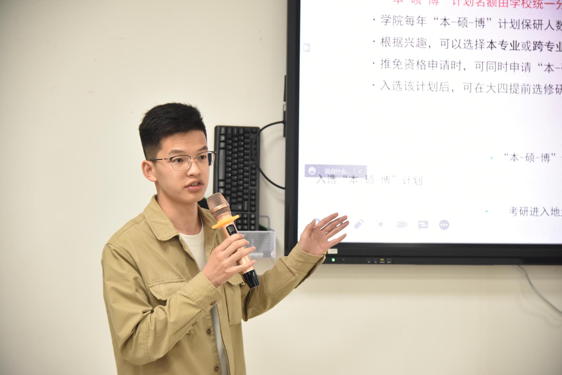 首先,2018级中加项目学生李宜伦以专业绩点排名第一的成绩获得保研推免至武汉大学水利水电学院,他从夏令营、预推免和正式推免三个阶段的流程,院校选择,联系导师,学院推免方案等方面进行了详尽的讲解,鼓励同学们尽早确定方向,找准自己的专业目标,努力提升自身水平和综合素质;贺沁文通过我校“本硕博”贯通培养计划获得保研推免资格,将攻读beat365官网环境科学与工程专业(直博),他就计划介绍、参选条件、录取流程、前期流程等方面对该计划进行介绍,建议同学们慎重抉择,提前做好规划,尽早与导师取得联系,在保研之路上放平心态、张弛有度。