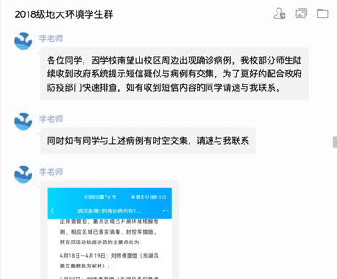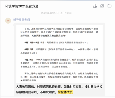 “请同学们自查行动轨迹,和感染者有时空交集和收到短信的同学立即报备”