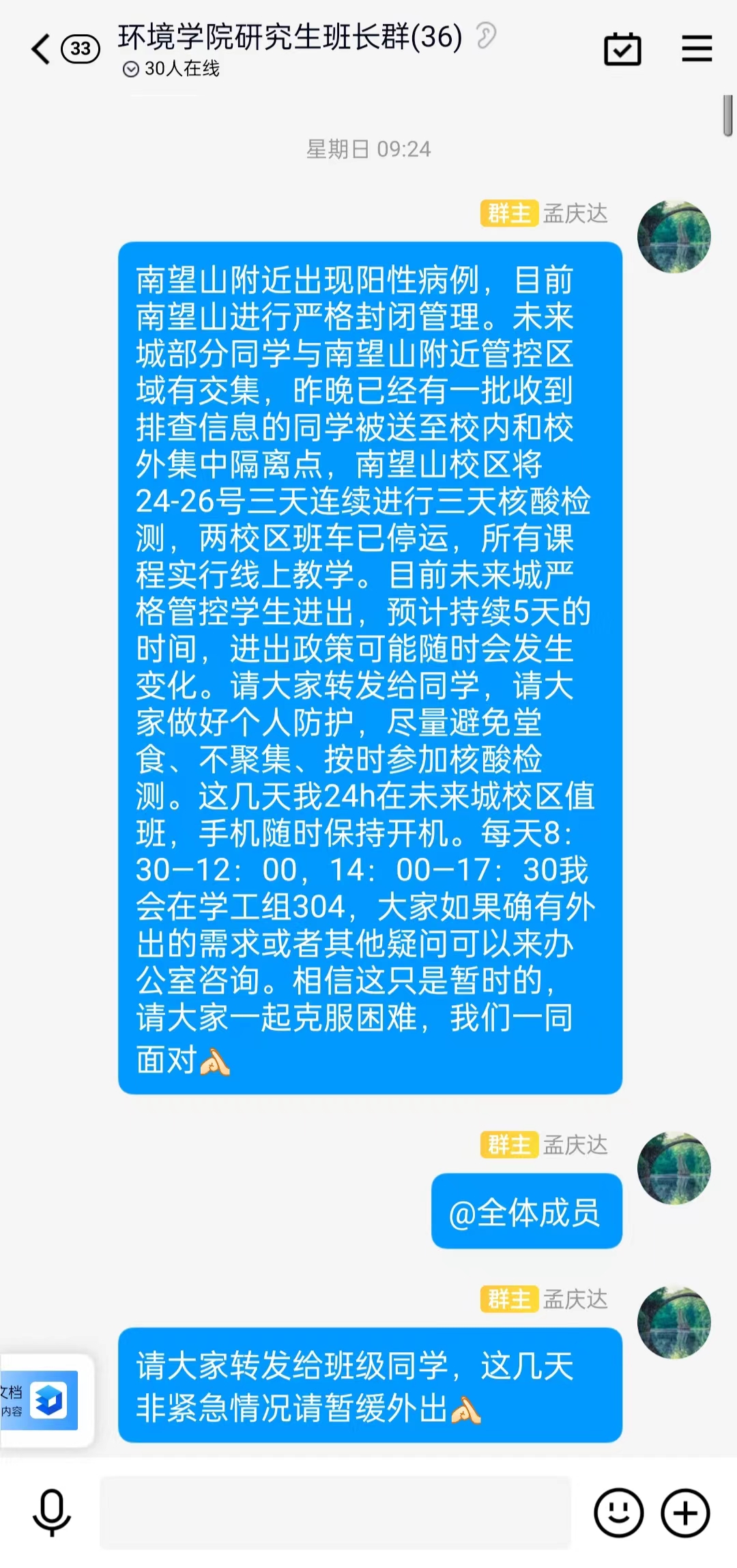 beat365中文官方网站学工组专职辅导员们以在岗、在线、在位等多种形式,在学生宿舍、微信群、QQ群等岗位上落实疫情防控的各项举措。按照学院党委统一部署,他们迅速织密疫情防控工作网络,第一时间将官方通知和权威信息传递到每一位学生,做到信息全覆盖、全知晓;第一时间摸排学生情况,在校人数、集中健康监测人数、校外隔离人数、未返校人数等,牢牢掌握全体本研学生的信息。“点对点”盯好重点人头核酸检测“一次不差”,“面对面”指挥全员核酸摸排“一个不漏”,“键对键”落实“日报告”“零报告”制度“雷打不动”,他们层层加固疫情防线堡垒,用每一个精准的学生数据构筑起疫情防控的安全网络。充分发挥思想政治优势和密切联系学生优势,用实际行动践行“立德树人”的初心使命,贯彻落实“学生在哪里,思想政治教育就在哪里”的工作信念。第一时间通过网络平台召开疫情防控主题年级大会、党员大会、班团会等,引导学生从身边故事中汲取精神养料,在关注国情中强化制度自信。