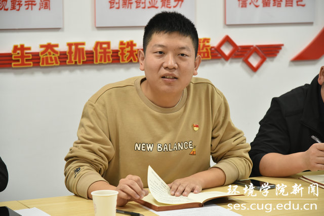 曾杰老师领学习近平总书记给山东省地矿局第六地质大队全体地质工作者的重要回信精神。他首先带领大家重温了习近平总书记回信原文,并传达了自然资源部党组、学校党委专题学习会议精神。最后他结合个人经历,从一名地质人、一名地质教育工作者、一名党员三个角度分享了个人体会。他说,总书记肯定了地质工作者的工作精神,指出了矿产资源在经济社会发展和资源安全方面的重要性,在学习回信精神后,他倍感温暖、倍受鼓舞。他提到,地质专业大有可为,青年学生要传承地大人为国找矿、地质报国的红色基因,树立远大理想,脚踏实地,甘于奉献,以扎实的地质专业基础,投入到社会主义现代化建设中去。